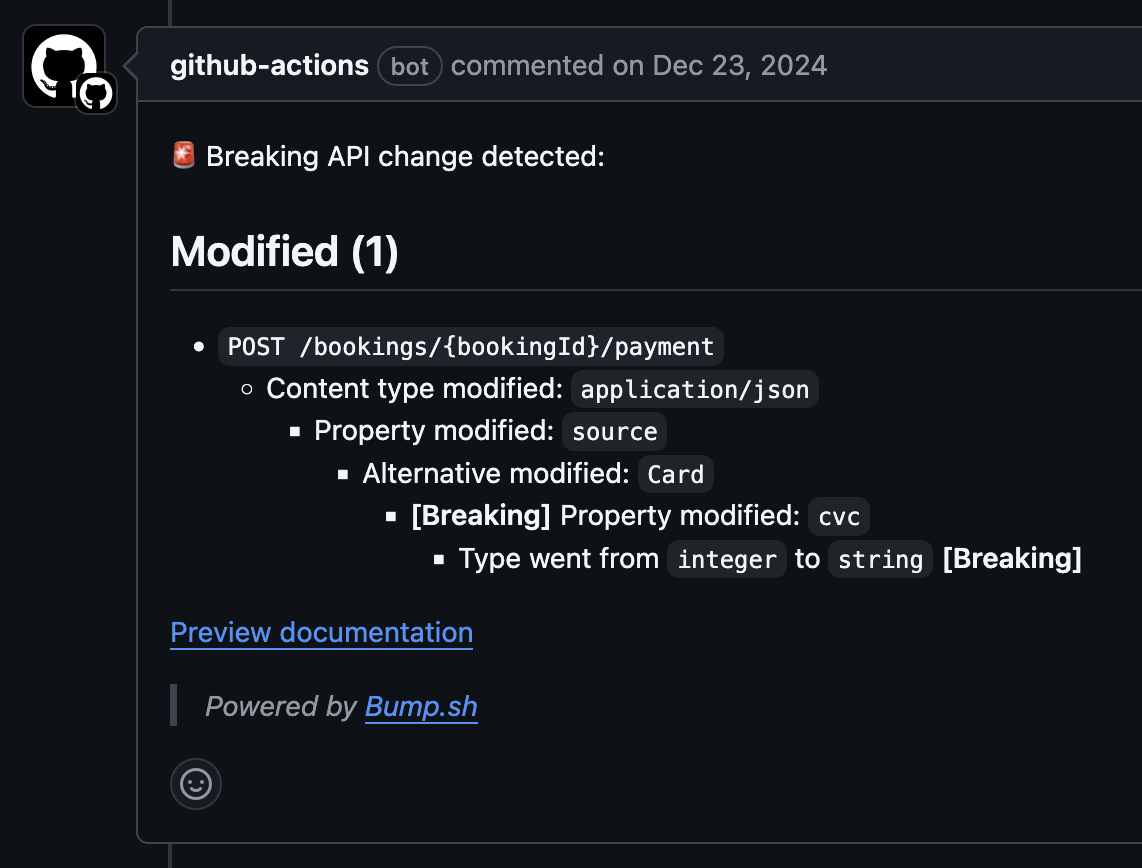 Whenever a pull request is made, or changes are pushed to that pull request, Bump.sh will automatically scan the changes being made to the OpenAPI/AsyncAPI documents. Any consequential changes will be highlighted in the summary of changes.