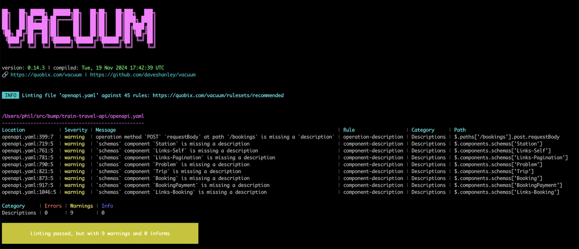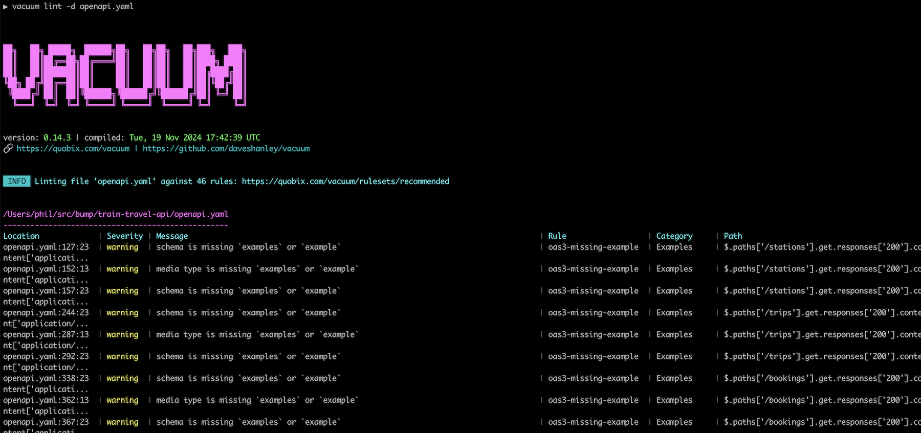 If there is anything fundamentally broken with the API description then vacuum will consider that an “Error”, but in this instance it looks like the Train Travel API is missing quite a few examples. Maybe that’s not something I’m too worried about if I’m not using this OpenAPI document for API documentation or mock servers, and if that’s the case for you you can turn off that rule.