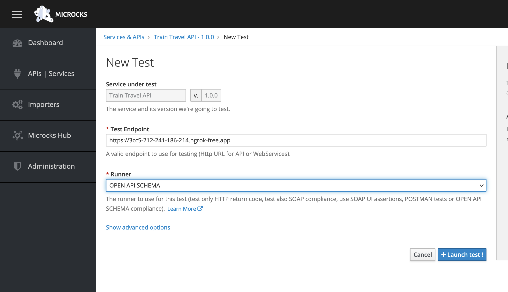 Once Microcks knows about your API(s), we are almost ready to run compliance/contract testing. This means comparing the OpenAPI and the real API implementation, which of course means we’ll need to have the API running on a URL where Microcks can access it.
