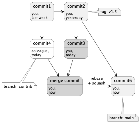 When your colleague needed to start her work last week, she did not have to ask you for the latest release: she just picked up the files from branch main (commit1 at the time). Today, she delivered her work in the separate branch “contrib” and asked you to integrate her work into main.
