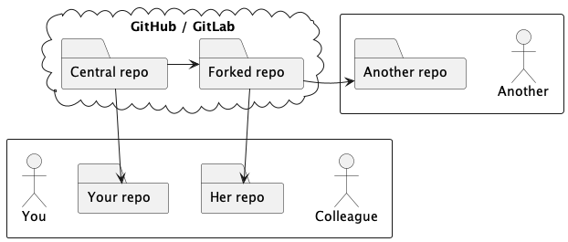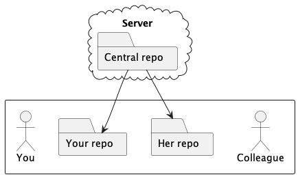 To coordinate the work of multiple people, one of the repositories is designated the central one, and everyone clones, pulls, and pushes to that repository. This central repository is typically hosted on a server and, often, on a platform such as GitHub or GitLab.
