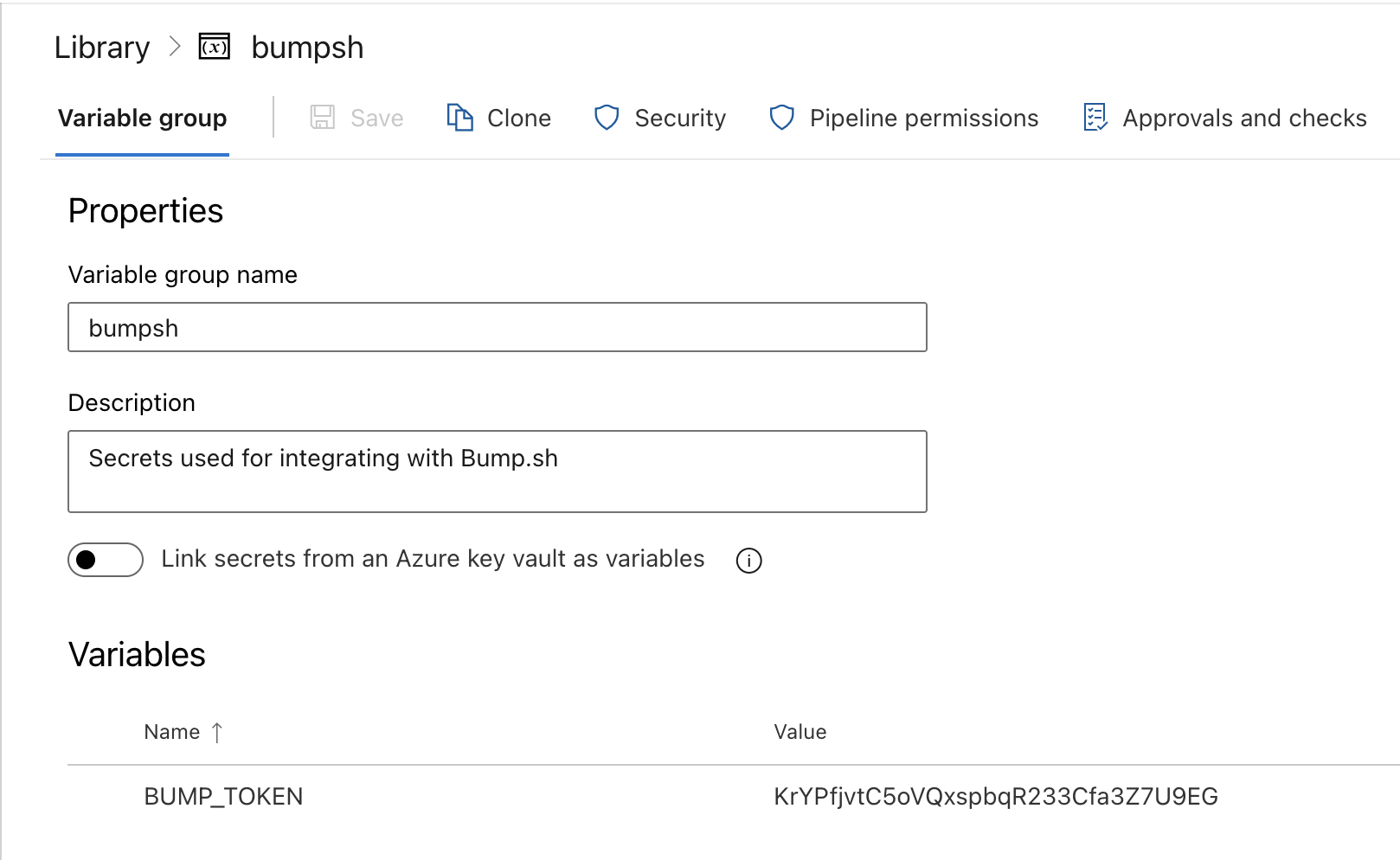 Back in the Azure variable group page, create a new variable called BUMP_TOKEN, paste in the API key, and click the lock icon to make it secret.