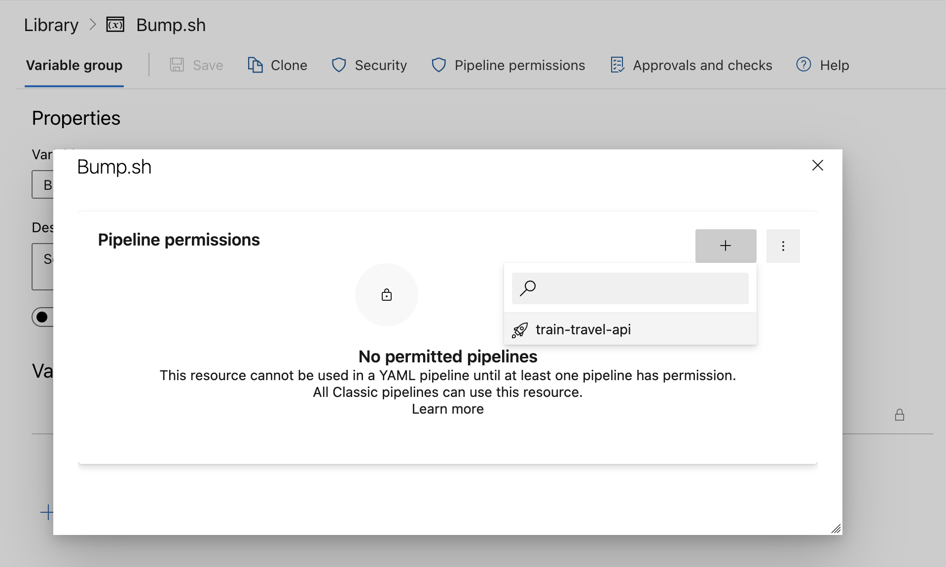 For security reasons, referencing the variable group in the YAML workflow is not enough to give the pipeline access to the variables. This requires one more step: click “Pipeline permissions” and select your pipeline.