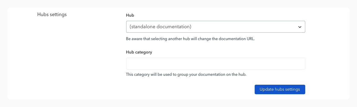 From any documentation settings, you can choose to move it to an existing hub. The “Hubs Settings” section allows you to choose which hub to associate this documentation with. You can also specify a category if necessary.